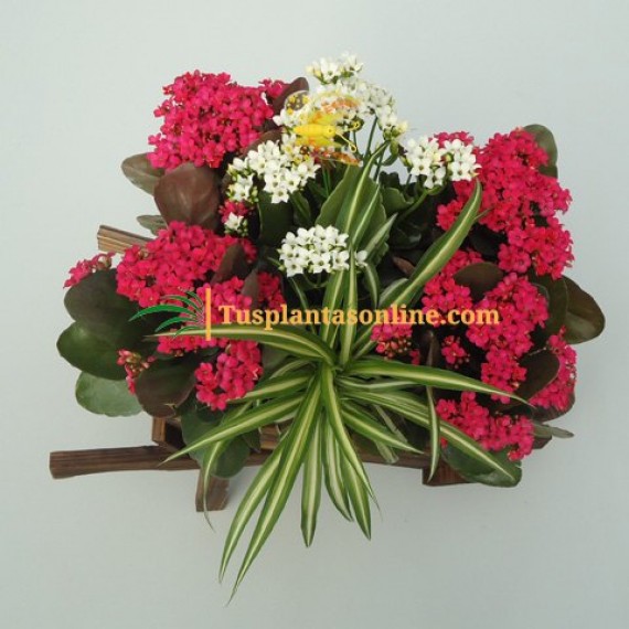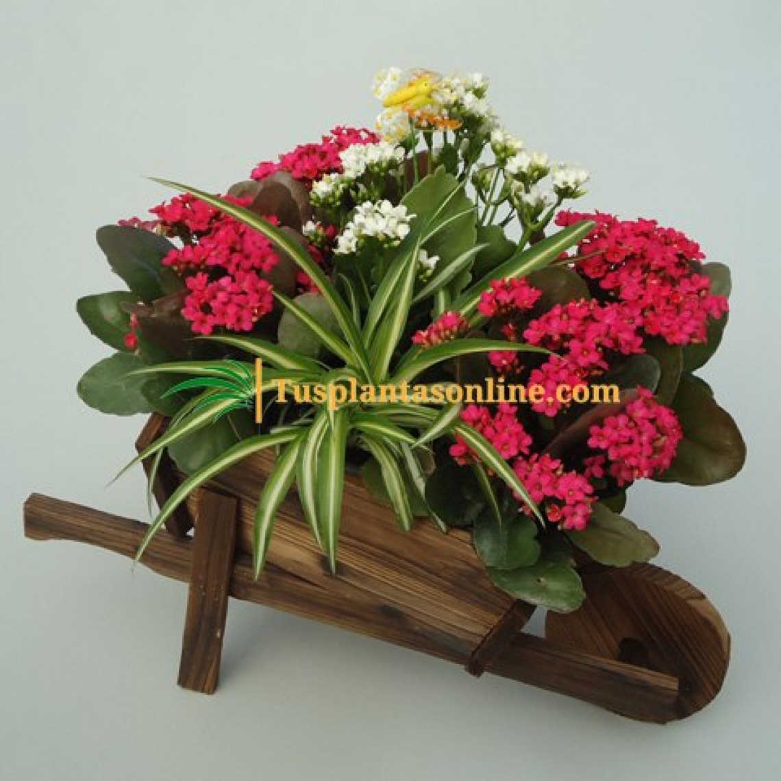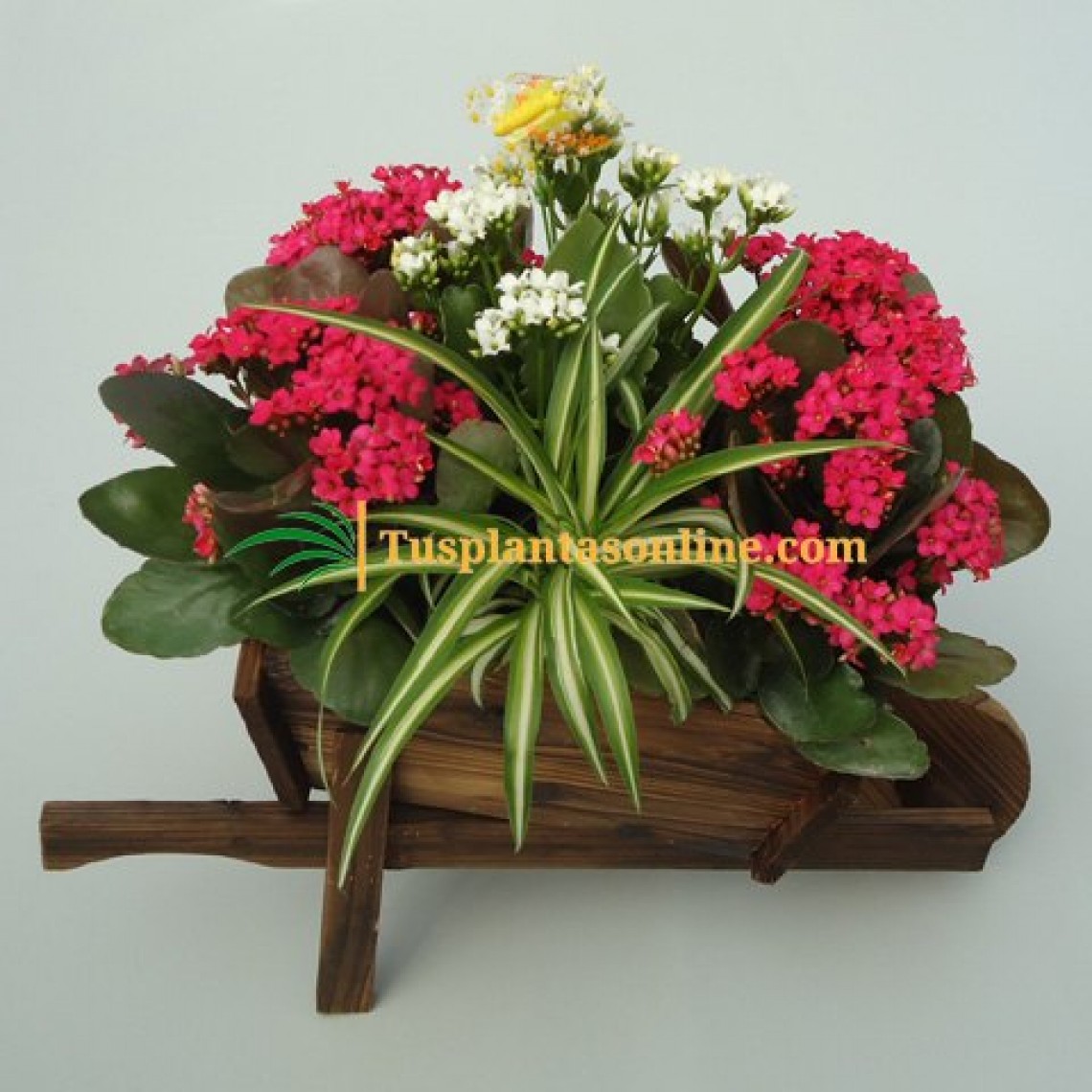 Composición en carretilla pequeña de madera que contiene: cinco kalanchoes, una cinta y un pincho de libelula decorativo.Esta composición podrá variar en función de la disponibilidad de planta, la cual podrá ser sustituida por otra de similares características y colores.