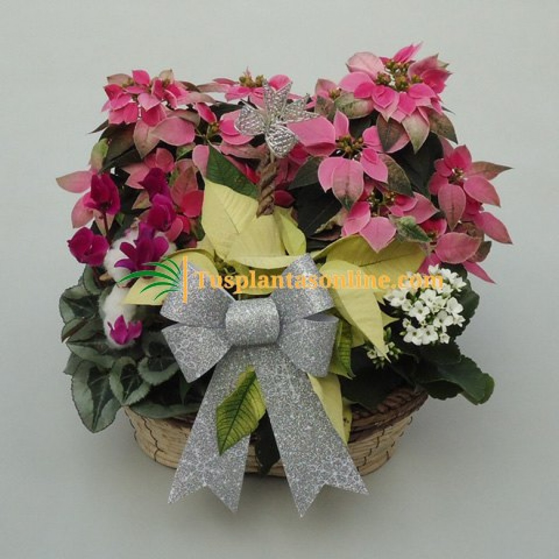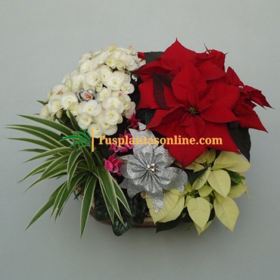 Composición A) cesta que contiene: 1 poinsettia M15 (flor de pascua), 1 poinsettia M13, 1 begonia elatior, 1 cyclamen mini, y 1 cinta. Adornos: 1 flor grande y 1 papa noel.Composición B) cesta que contiene: 2 princettia, 1 poinsettia, 1 cyclamen mini, y 1 kalanchoe. Adornos: 1 lazo grande y 1 lazo pequeño.Estas composiciones podrán variar en función de la disponibilidad de planta, la cual podrá ser sustituida por otra de similares características y colores.