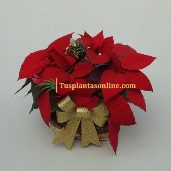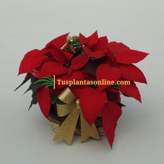 Composición en cesta que contiene: 2 poinsettia (flor de pascua). Adornos: 1 lazo pequeño y 1 regalito.Esta composición podrá variar en función de la disponibilidad de planta, la cual podrá ser sustituida por otra de similares características y colores.