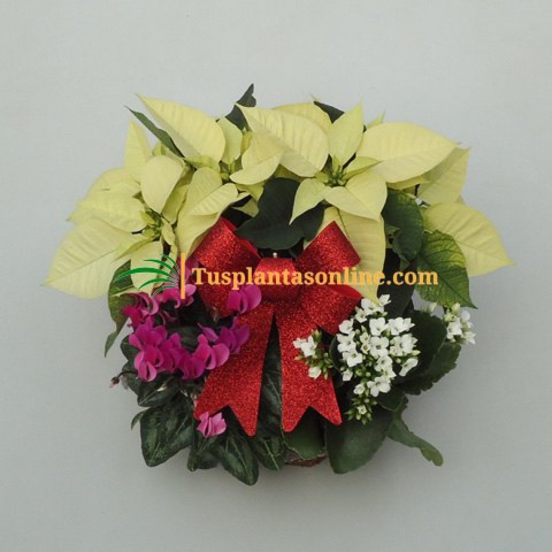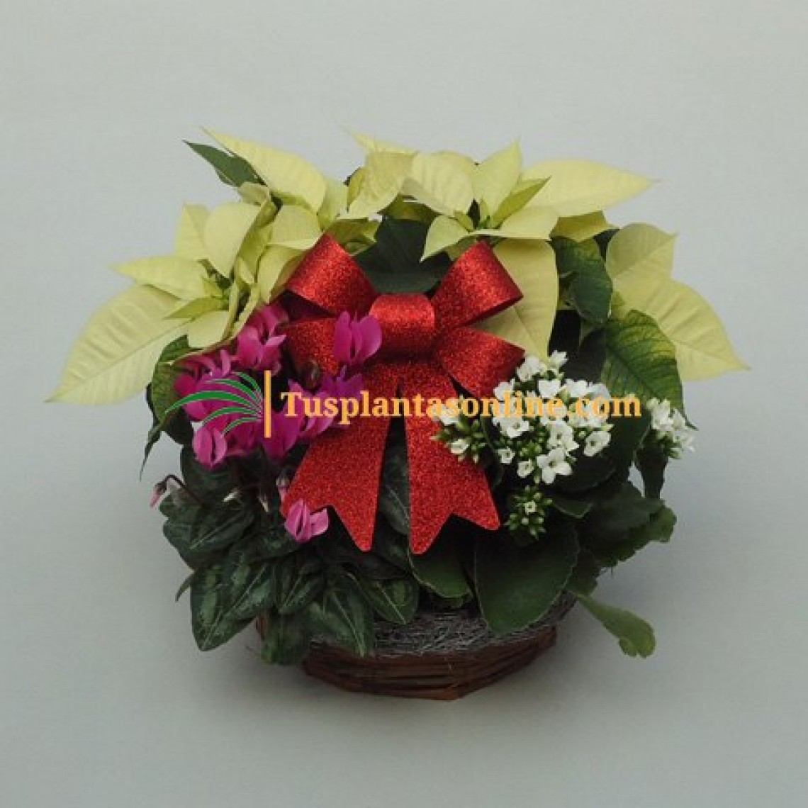 Composición en cesta que contiene: 2 poinsettia (flor de pascua), 1 cyclamen mini, 1 kalanchoe. Adornos: 1 lazo pequeño.Esta composición podrá variar en función de la disponibilidad de planta, la cual podrá ser sustituida por otra de similares características y colores.