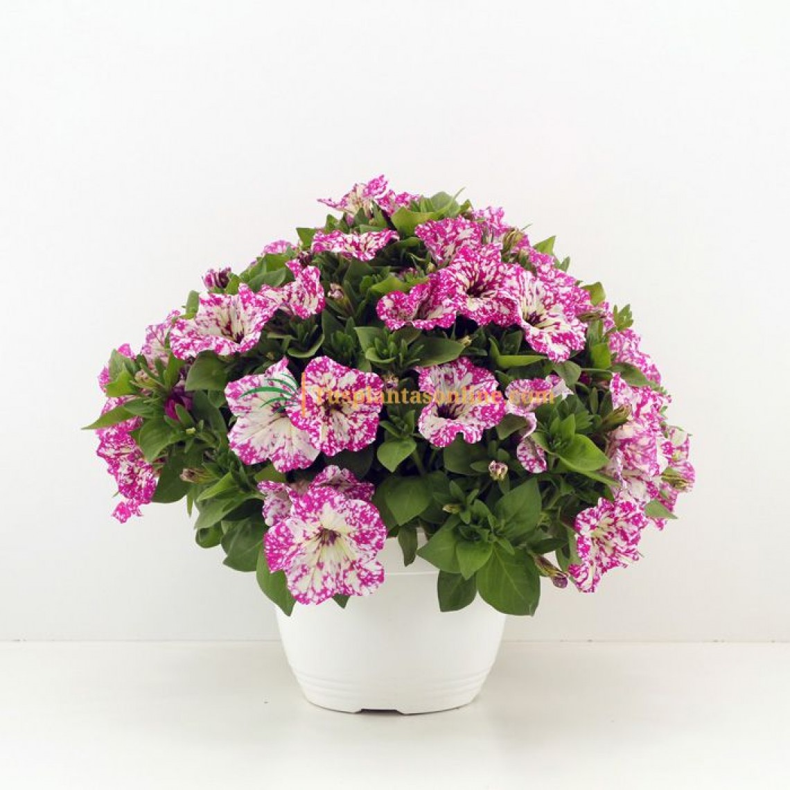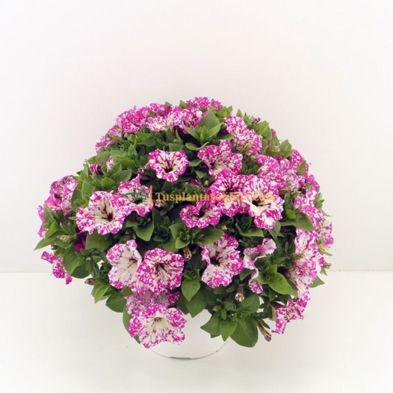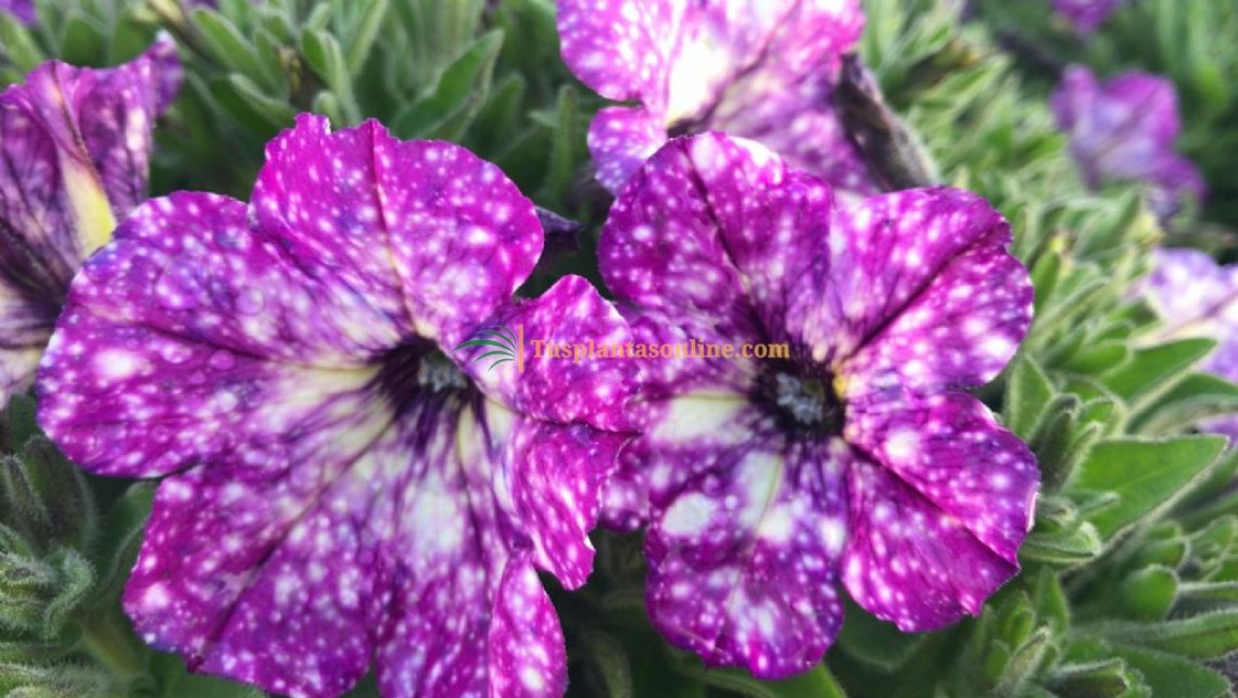 La Surfinia nazareno presenta unos colores moteados muy característicos y espectaculares. Tienen unos cuidados muy similares a las petunias ya que son un híbrido de estas últimas. La planta alcanza un buen volumen y son ideales para ser colgadas, destacan sus flores acampanadas. En este caso tienen un tono que recuerda a un cielo estrellado, moradas con puntos blancos.