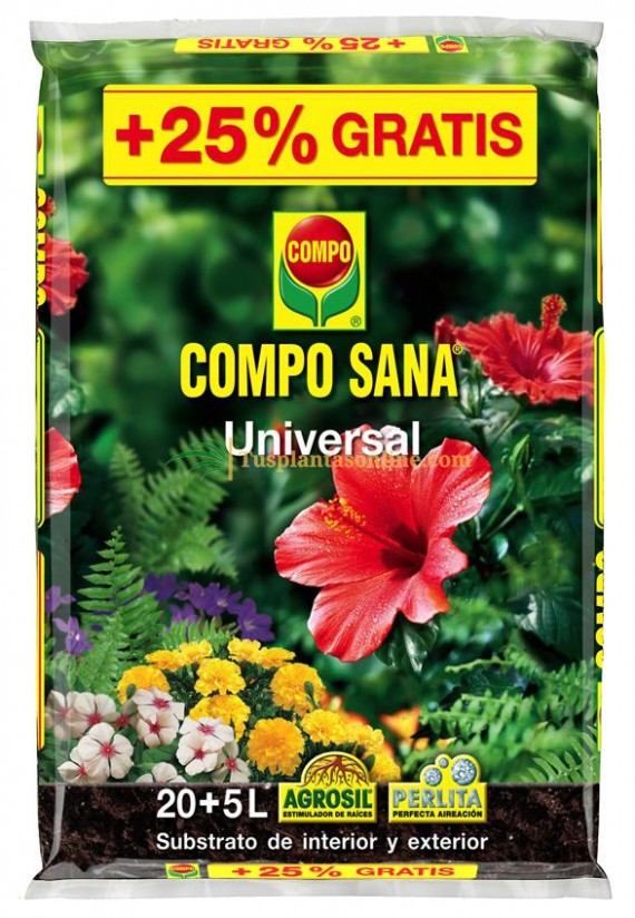 Sustrato en formato de 25 L (20 + 5 de regalo), de alta calidad idóneo para interiores y exteriores. Contiene Agrosil y perlita para estimular las raíces. Tiene un PH que oscila entre 5 y 6.5.Favorece la circulación del aire, agua y abono; facilitando de este modo el crecimiento de la planta.Composición:Saco. pH (CaCl2): 5,0 - 6,5Contenido en sal (KCl) g/l: < 2,5Contenido en abono: (Nutrientes solubles)200 - 450 mg/l Nitrógeno (N)200 - 500 mg/l Fosfato (P2O5)300 - 550 mg/l Óxido de potasio (K2O)