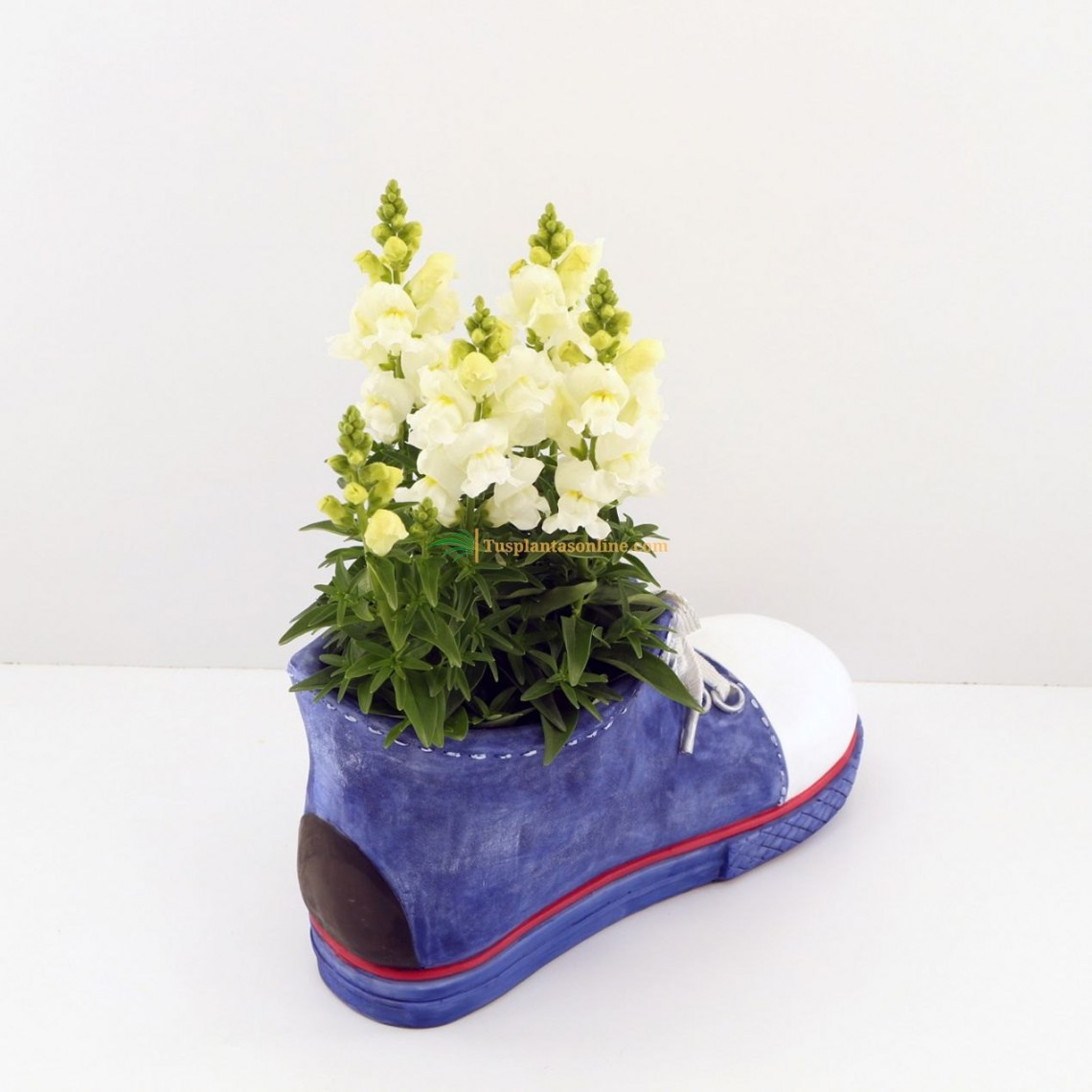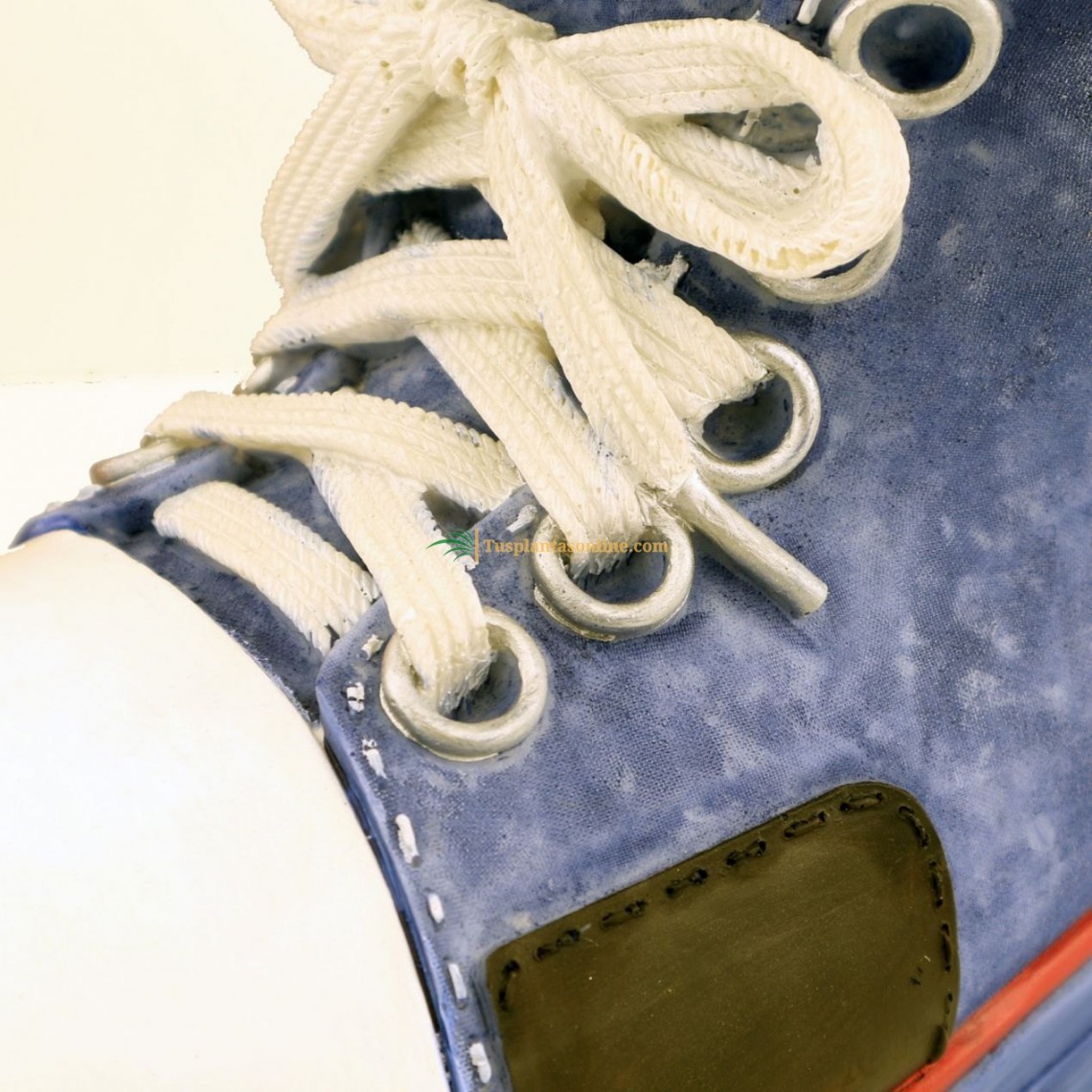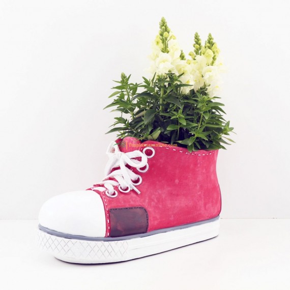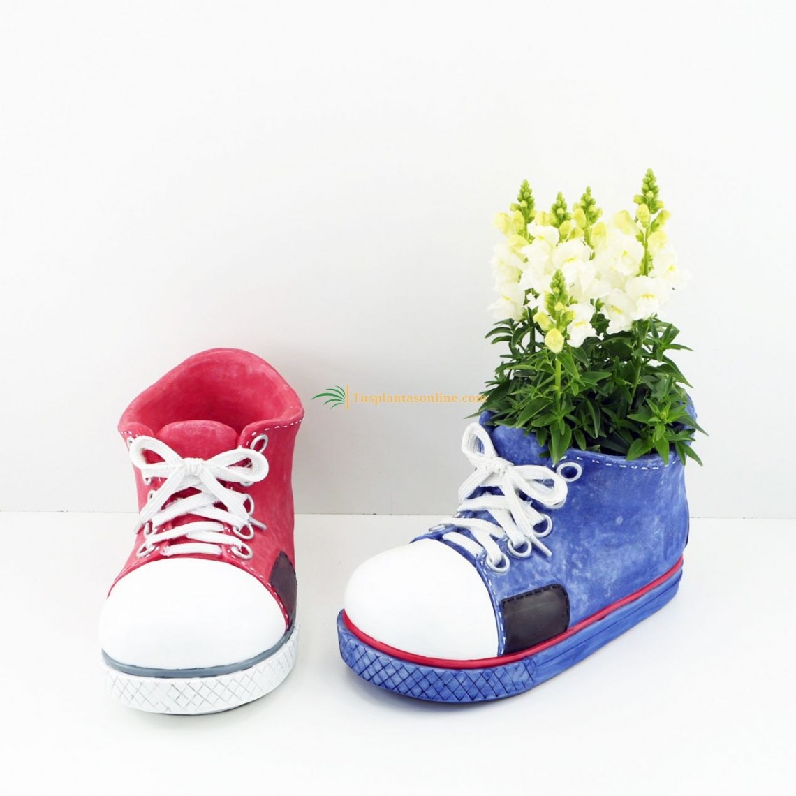 Cubremacetas con forma de zapatilla ideal para decorar casas y jardines. Se trata de una pieza elaborada en resina y con gran cantidad de detalles.Está disponible en color rojo o azul.*Las unidades se venden por separado, no incluye planta.
